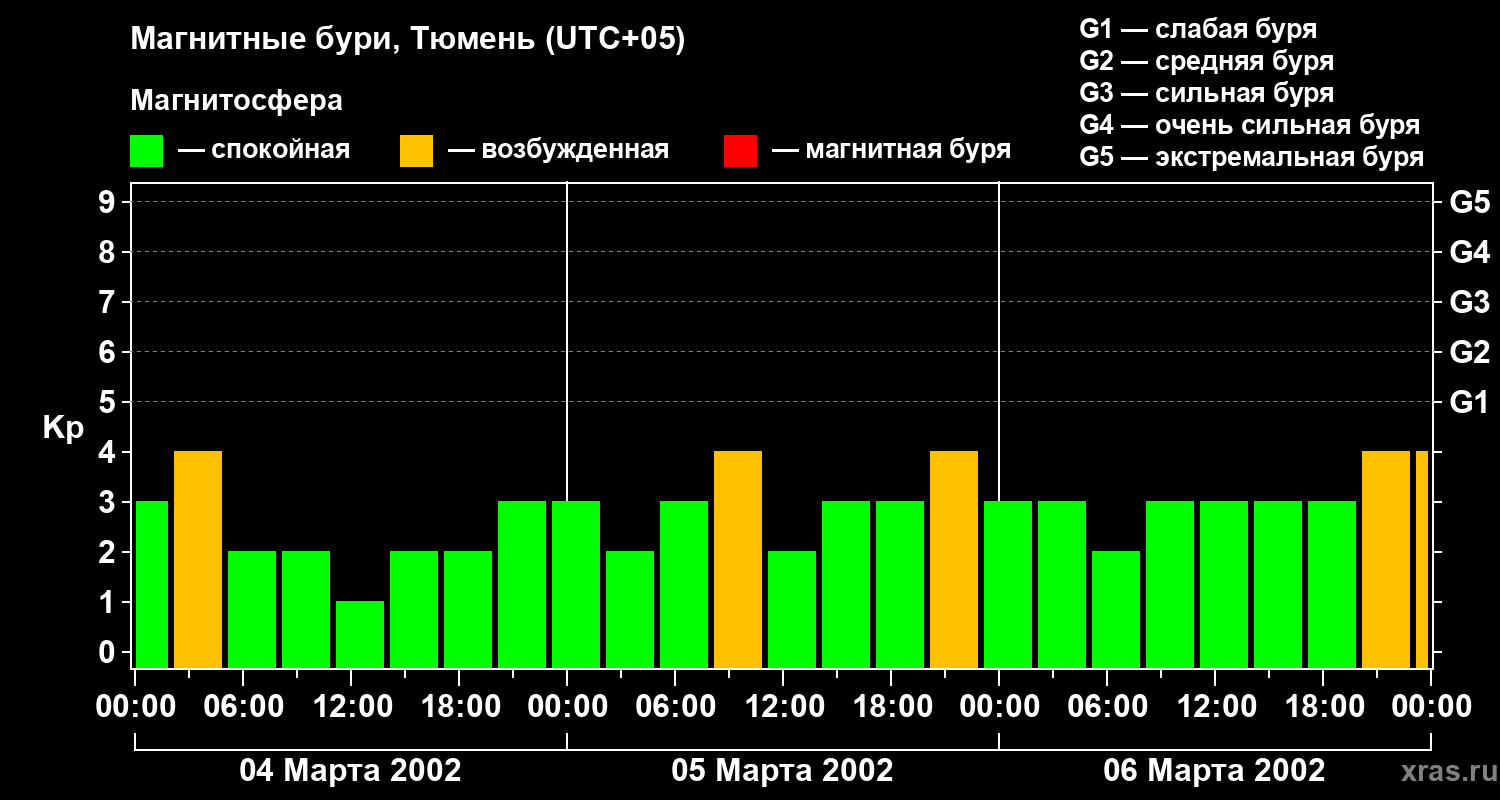 Изменения геомагнитного индекса Kp с 4 по 6 марта 2002 года для средних широт