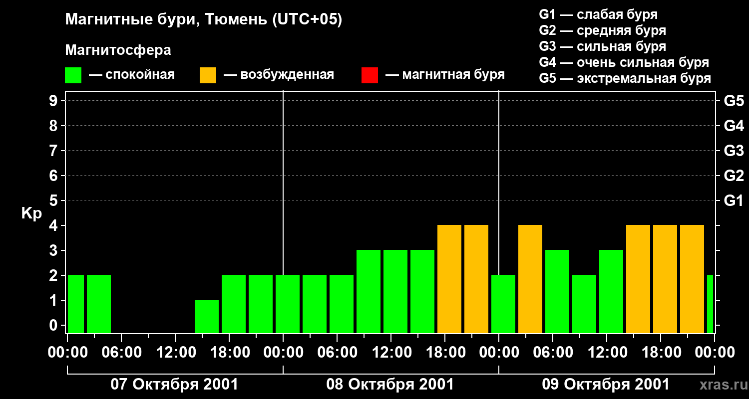 Изменения геомагнитного индекса Kp с 7 по 9 октября 2001 года для средних широт