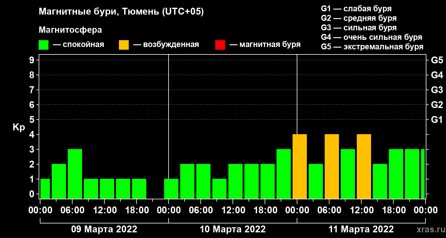 Изменения геомагнитного индекса Kp с 9 по 11 марта 2022 года для средних широт