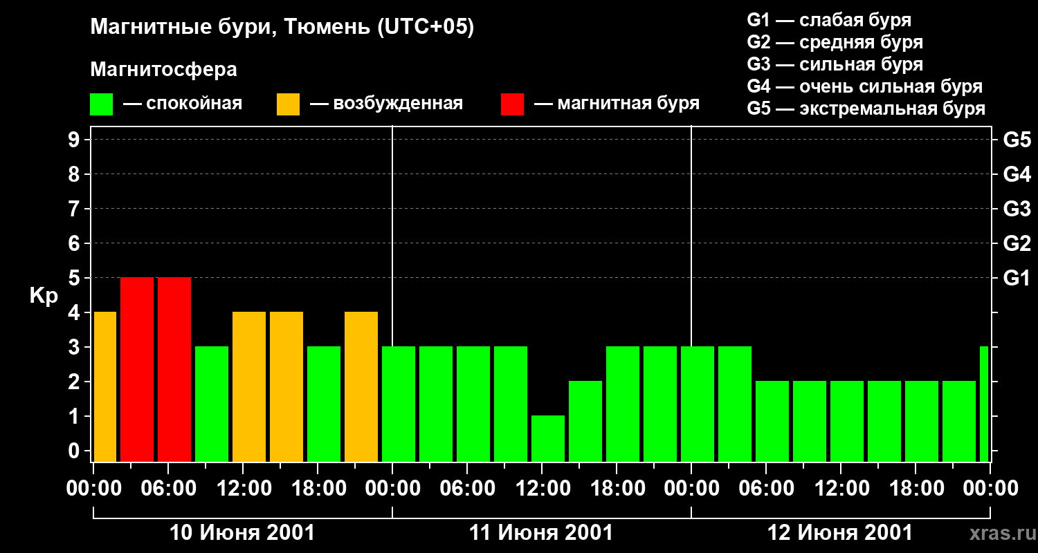 Изменения геомагнитного индекса Kp с 10 по 12 июня 2001 года для средних широт