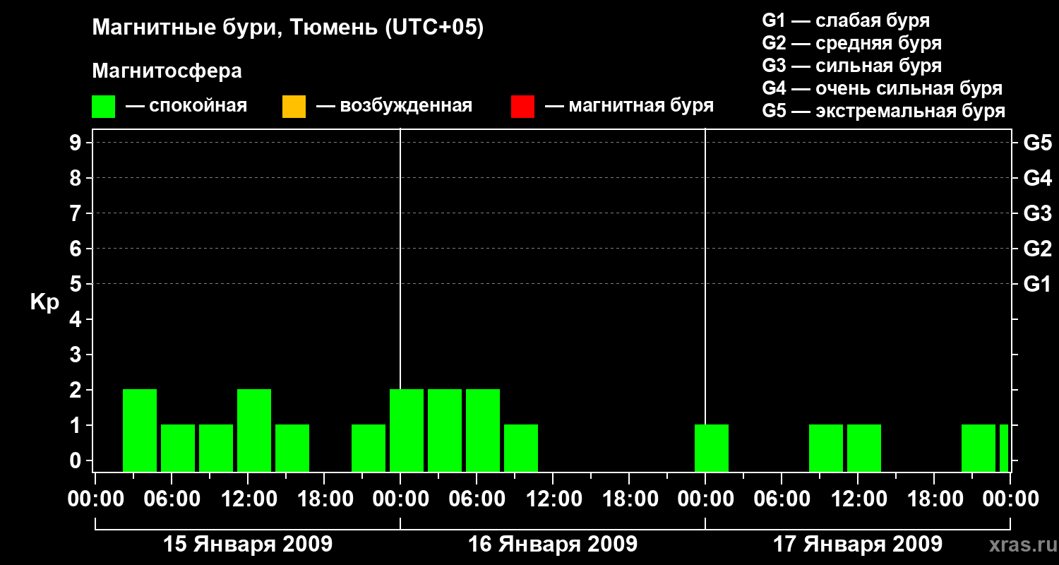 Изменения геомагнитного индекса Kp с 15 по 17 января 2009 года для средних широт