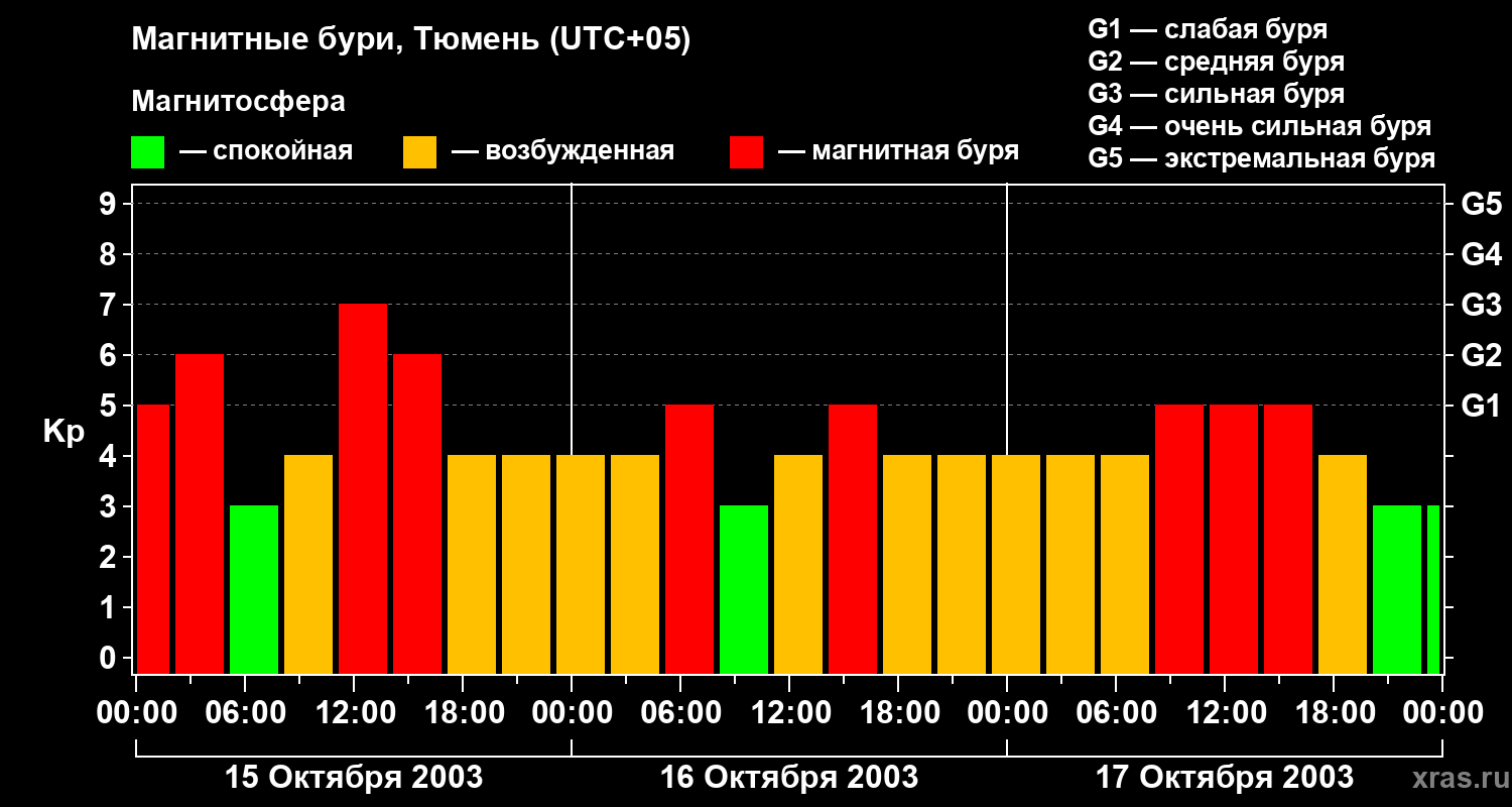 Изменения геомагнитного индекса Kp с 15 по 17 октября 2003 года для средних широт