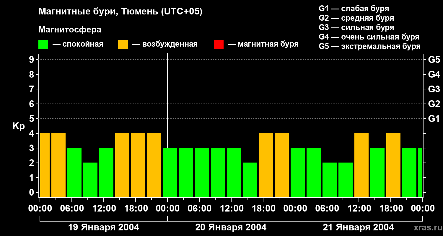 Изменения геомагнитного индекса Kp с 19 по 21 января 2004 года для средних широт