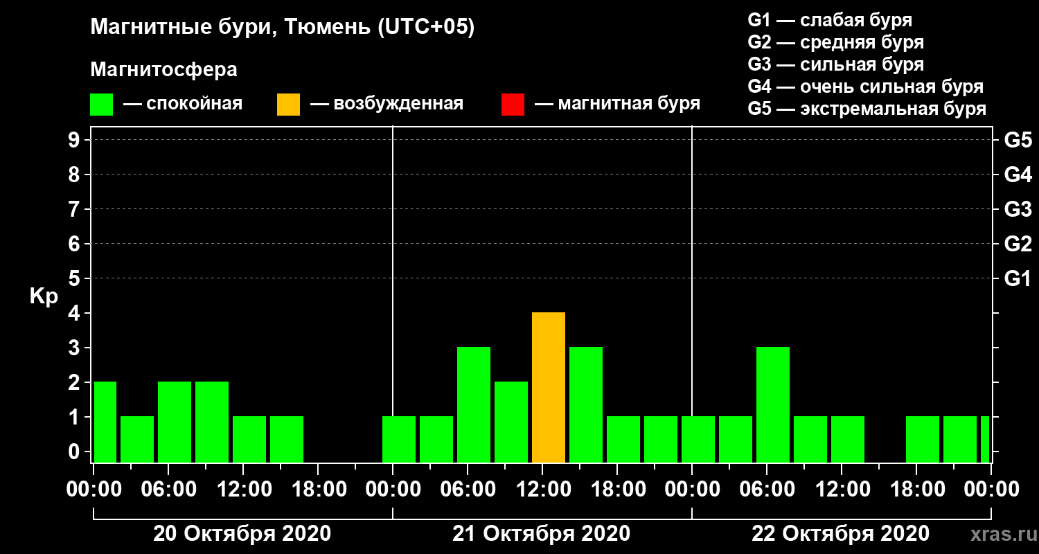 Изменения геомагнитного индекса Kp с 20 по 22 октября 2020 года для средних широт