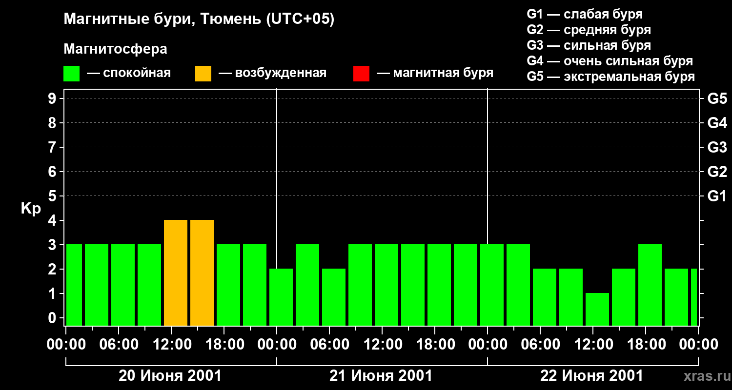 Изменения геомагнитного индекса Kp с 20 по 22 июня 2001 года для средних широт