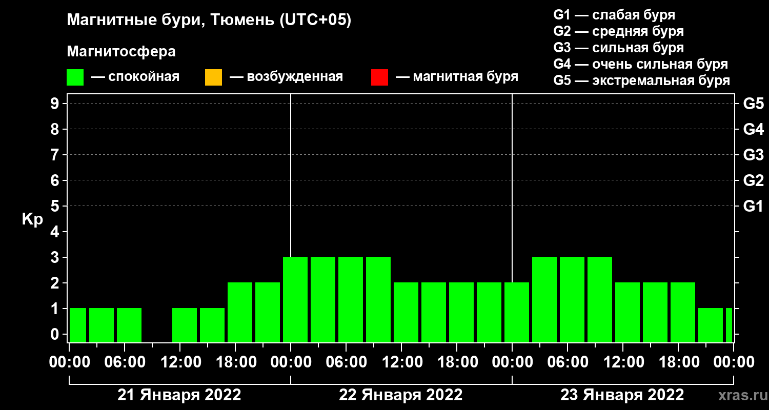 Изменения геомагнитного индекса Kp с 21 по 23 января 2022 года для средних широт