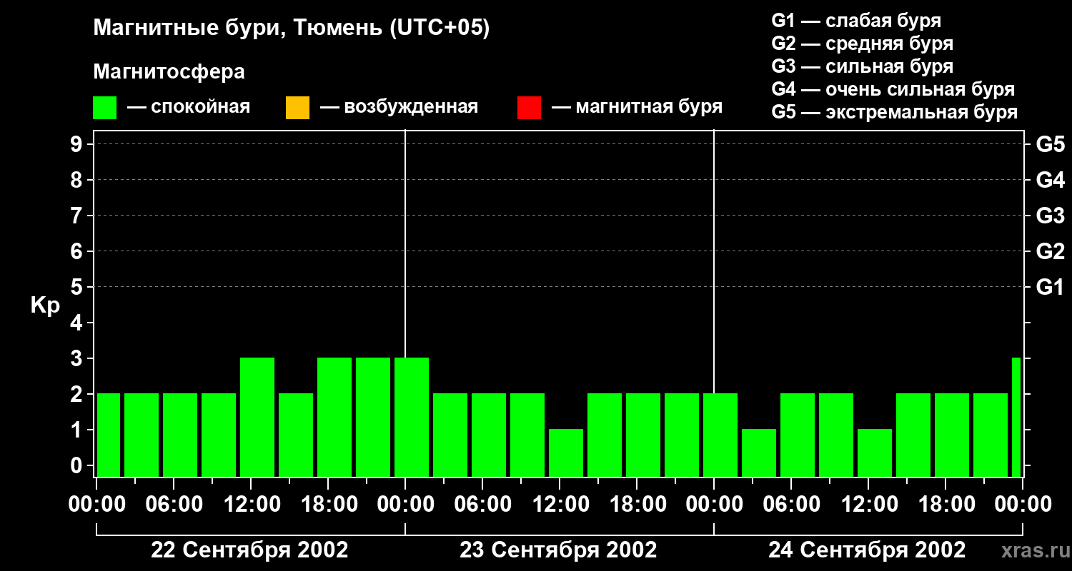 Изменения геомагнитного индекса Kp с 22 по 24 сентября 2002 года для средних широт