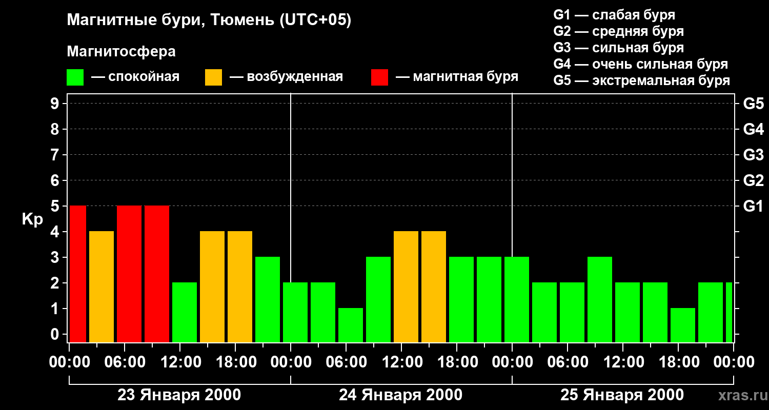 Изменения геомагнитного индекса Kp с 23 по 25 января 2000 года для средних широт