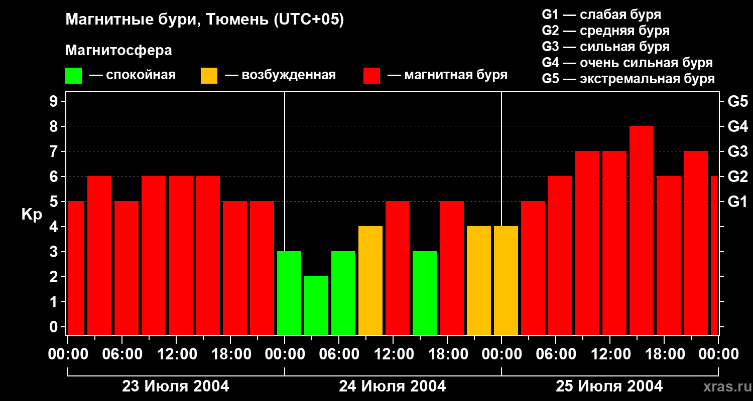 Изменения геомагнитного индекса Kp с 23 по 25 июля 2004 года для средних широт
