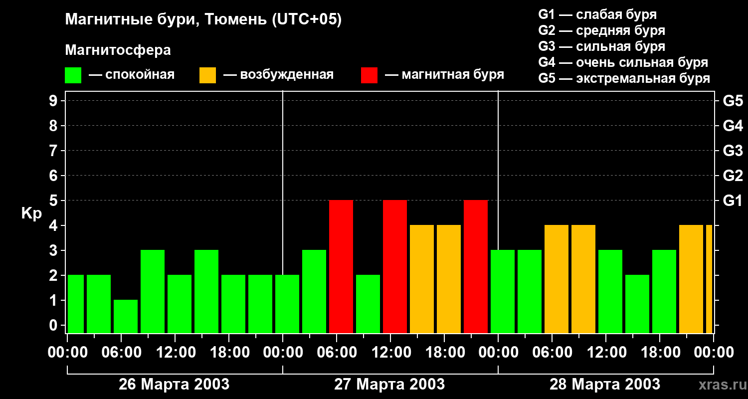 Изменения геомагнитного индекса Kp с 26 по 28 марта 2003 года для средних широт