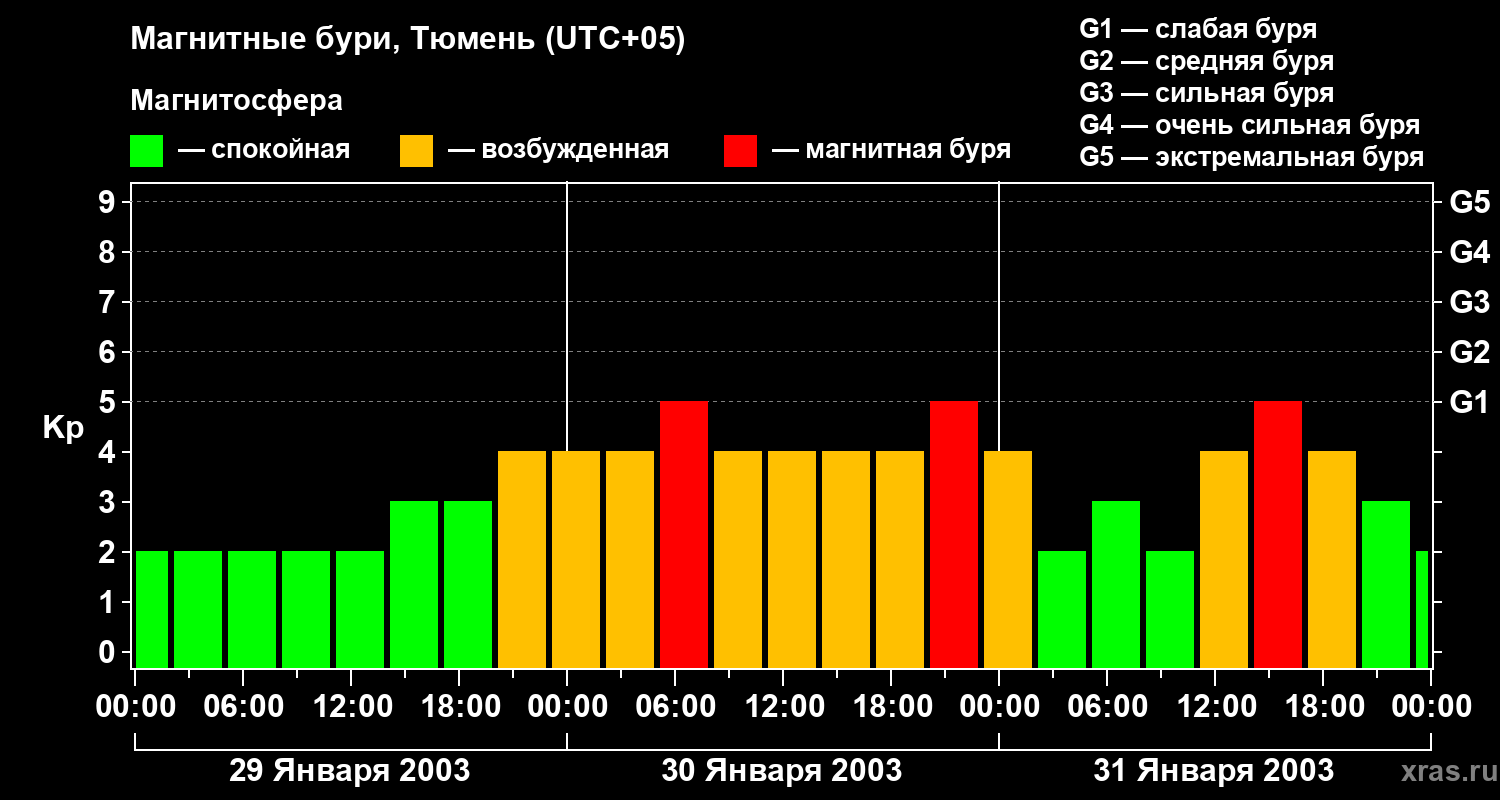 Изменения геомагнитного индекса Kp с 29 по 31 января 2003 года для средних широт