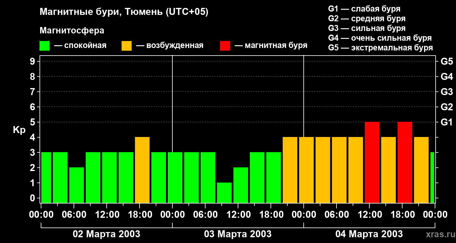 Изменения геомагнитного индекса Kp с 2 по 4 марта 2003 года для средних широт