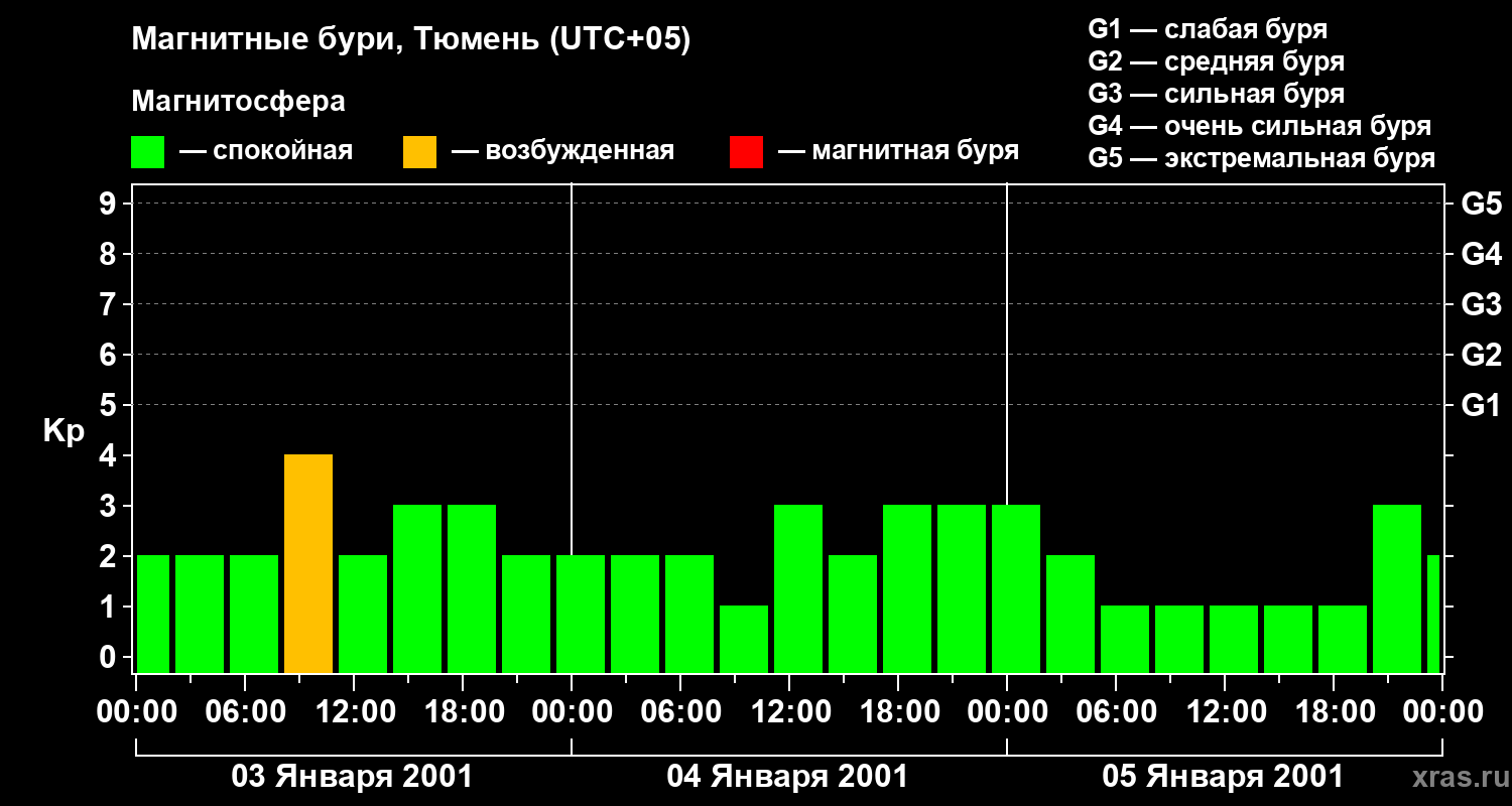 Изменения геомагнитного индекса Kp с 3 по 5 января 2001 года для средних широт