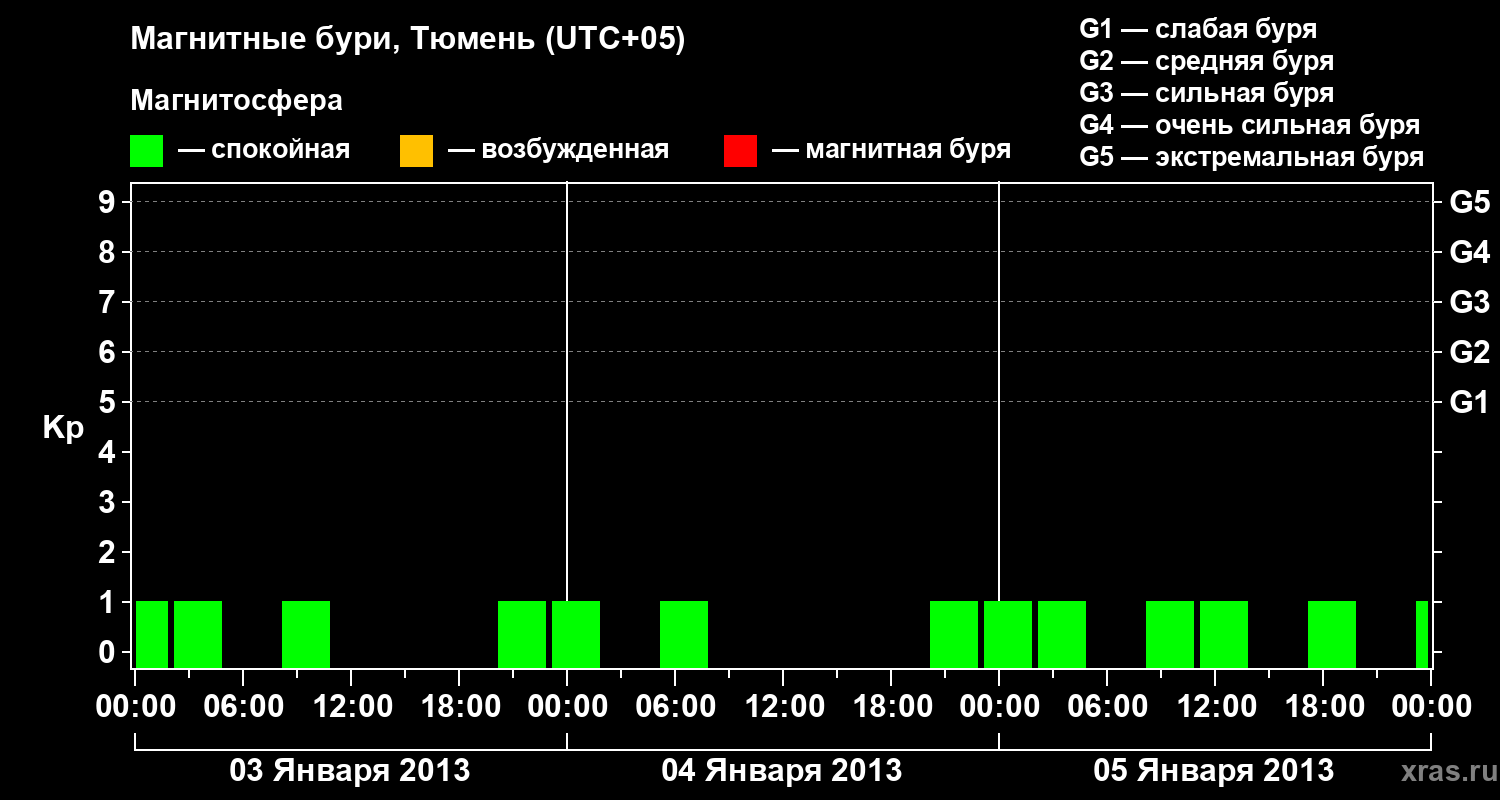Изменения геомагнитного индекса Kp с 3 по 5 января 2013 года для средних широт