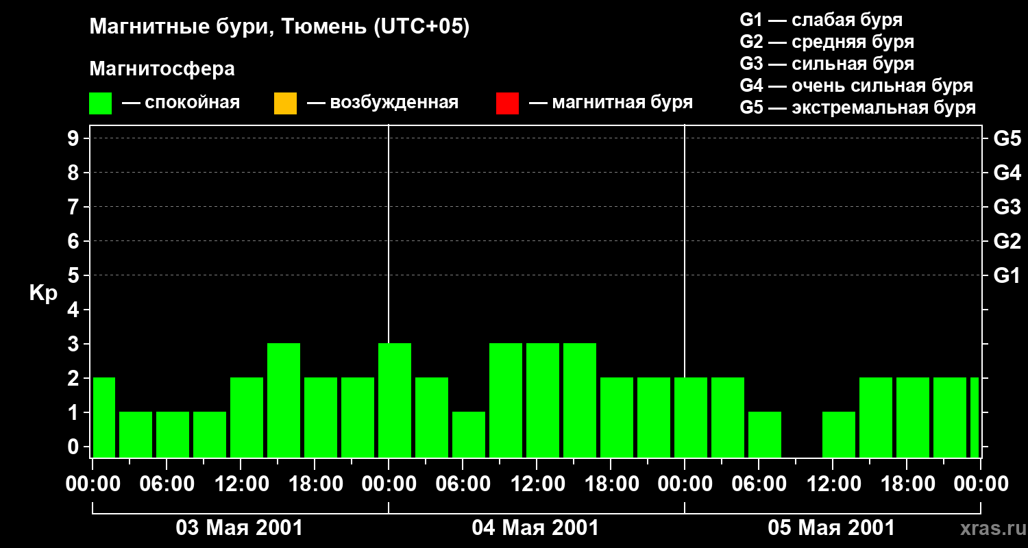 Изменения геомагнитного индекса Kp с 3 по 5 мая 2001 года для средних широт