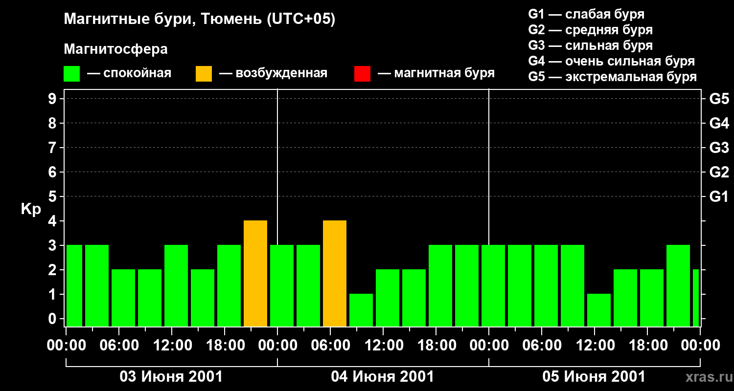 Изменения геомагнитного индекса Kp с 3 по 5 июня 2001 года для средних широт