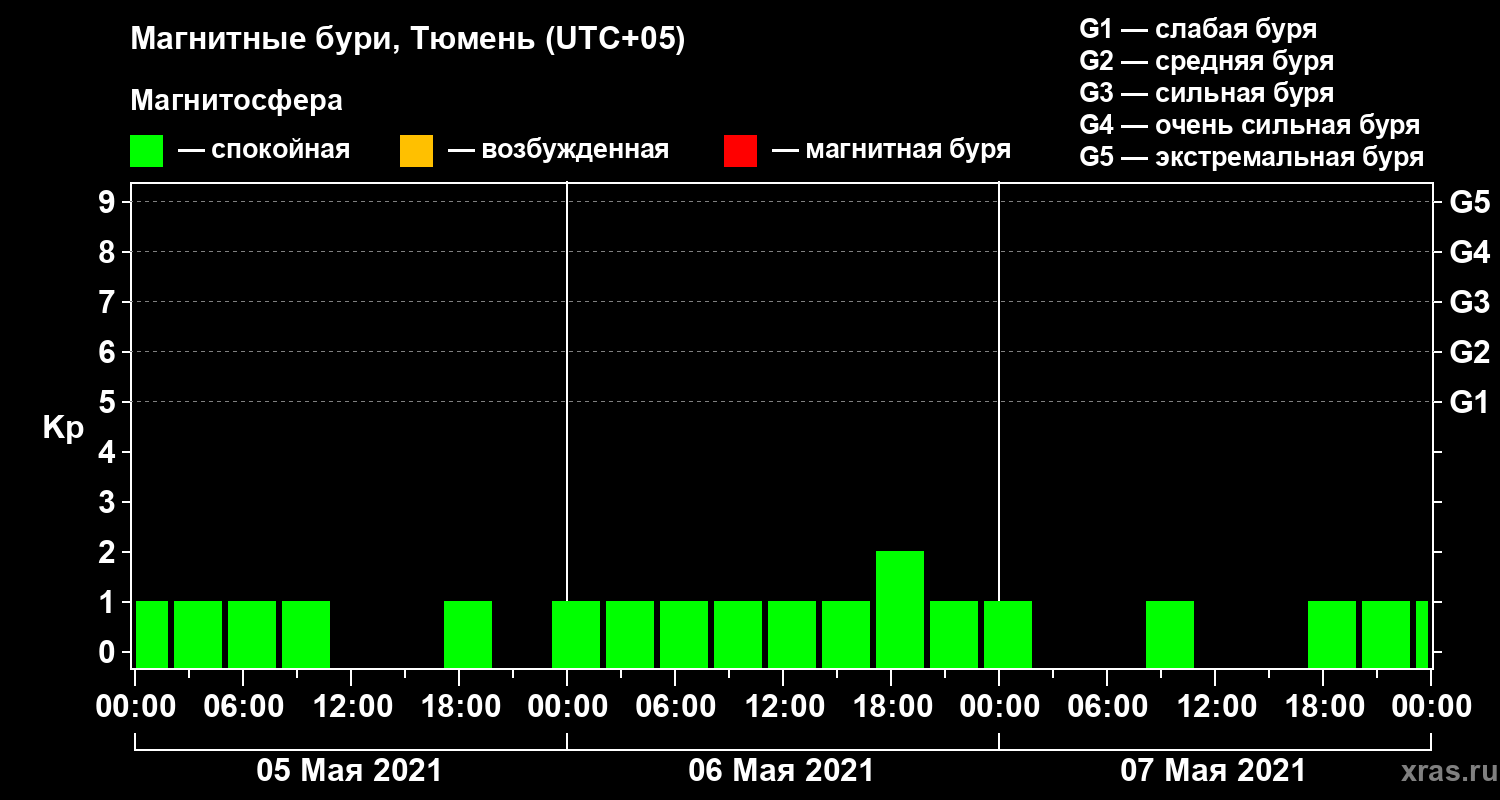 Изменения геомагнитного индекса Kp с 5 по 7 мая 2021 года для средних широт