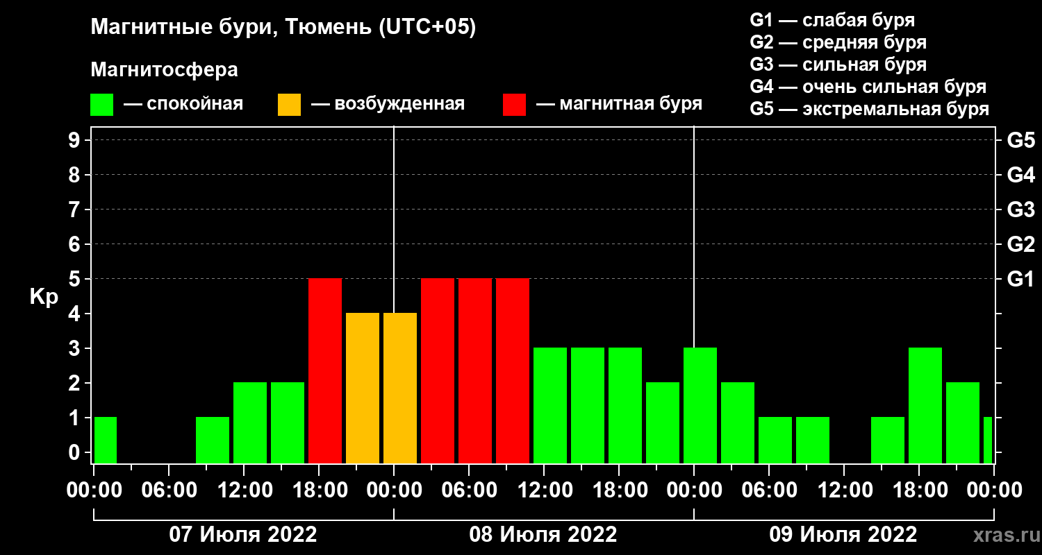 Изменения геомагнитного индекса Kp с 7 по 9 июля 2022 года для средних широт