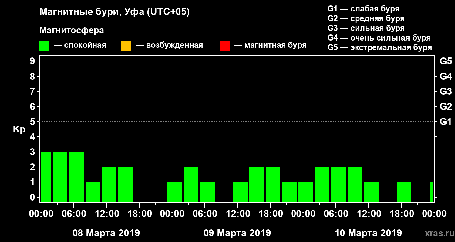 Изменения геомагнитного индекса Kp с 8 по 10 марта 2019 года для средних широт