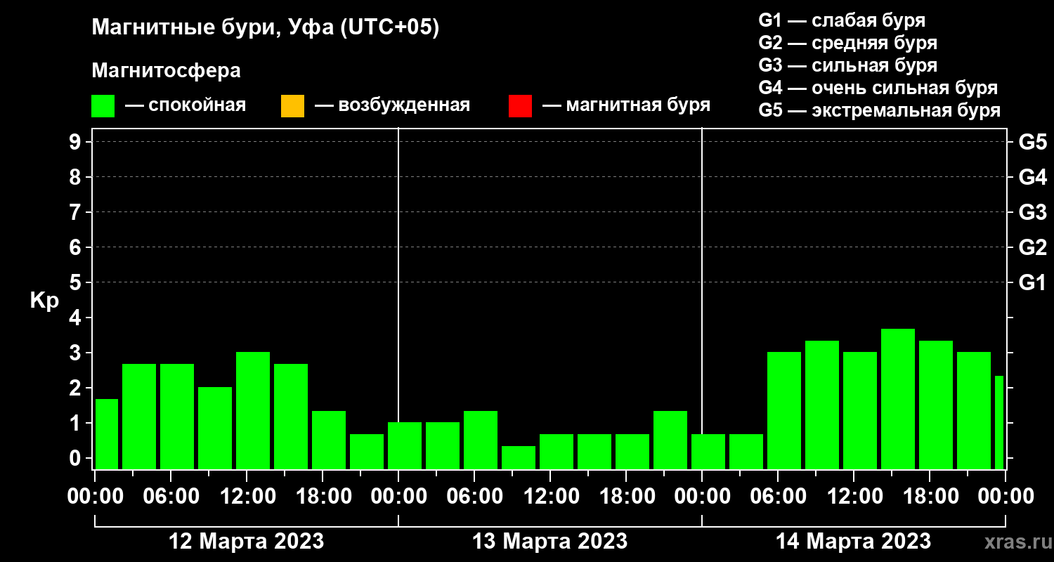 Изменения геомагнитного индекса Kp с 12 по 14 марта 2023 года для средних широт
