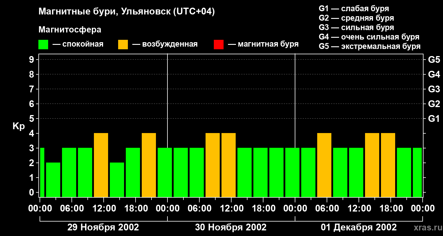 Изменения геомагнитного индекса Kp с 29 ноября по 1 декабря 2002 года для средних широт
