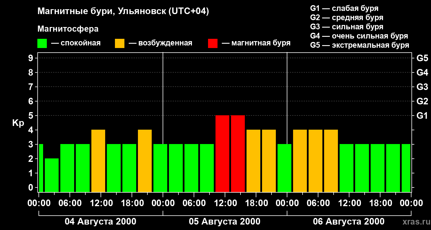 Изменения геомагнитного индекса Kp с 4 по 6 августа 2000 года для средних широт