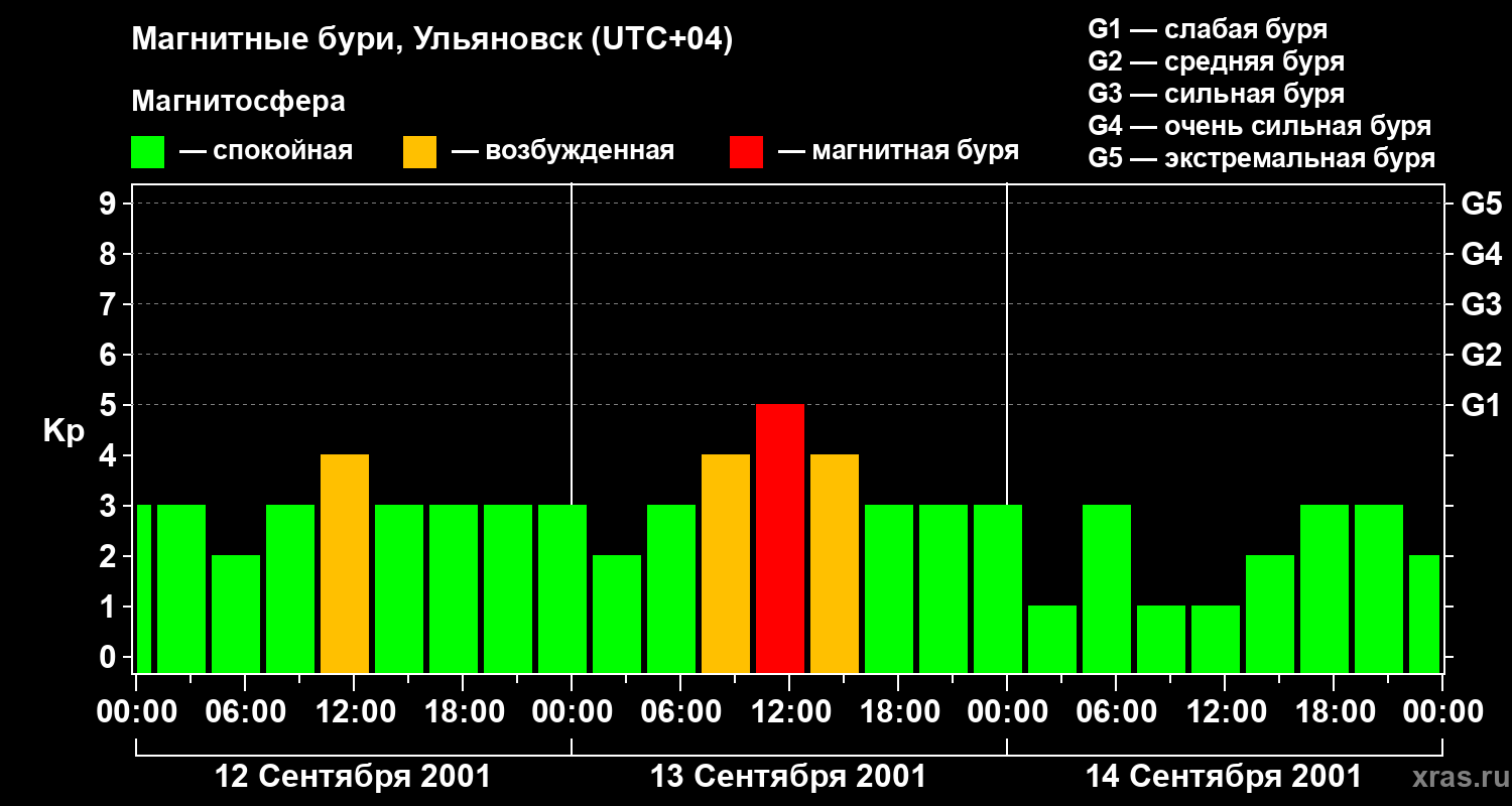 Изменения геомагнитного индекса Kp с 12 по 14 сентября 2001 года для средних широт