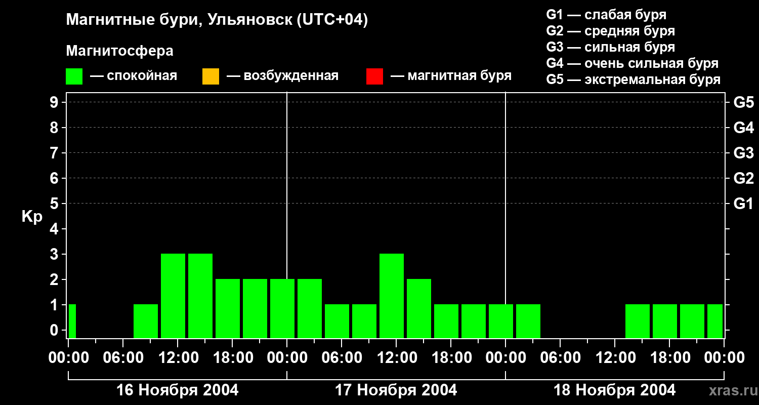 Изменения геомагнитного индекса Kp с 16 по 18 ноября 2004 года для средних широт