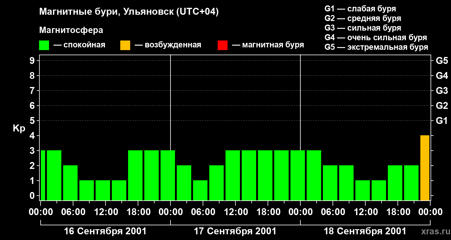 Изменения геомагнитного индекса Kp с 16 по 18 сентября 2001 года для средних широт