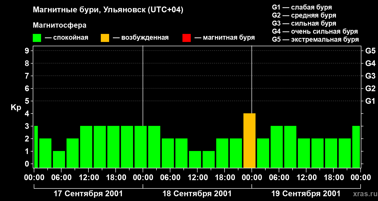 Изменения геомагнитного индекса Kp с 17 по 19 сентября 2001 года для средних широт