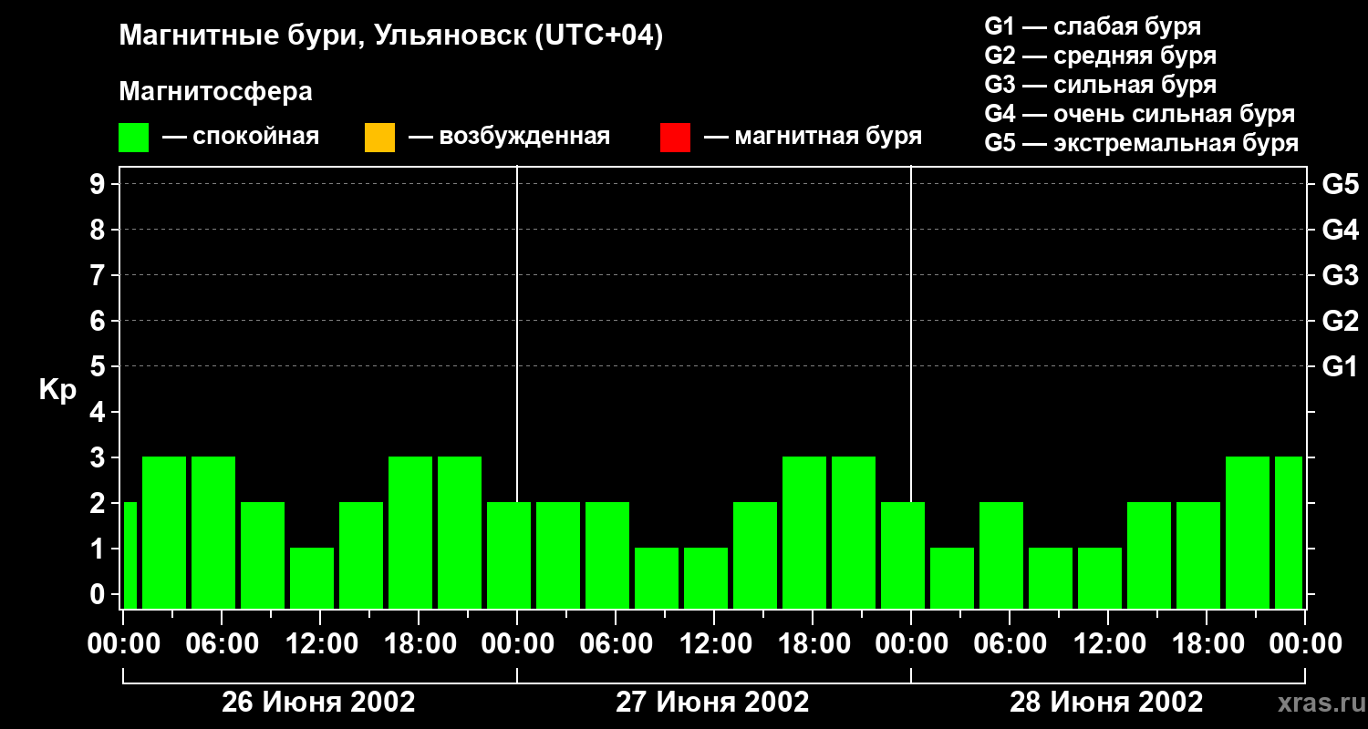 Изменения геомагнитного индекса Kp с 26 по 28 июня 2002 года для средних широт