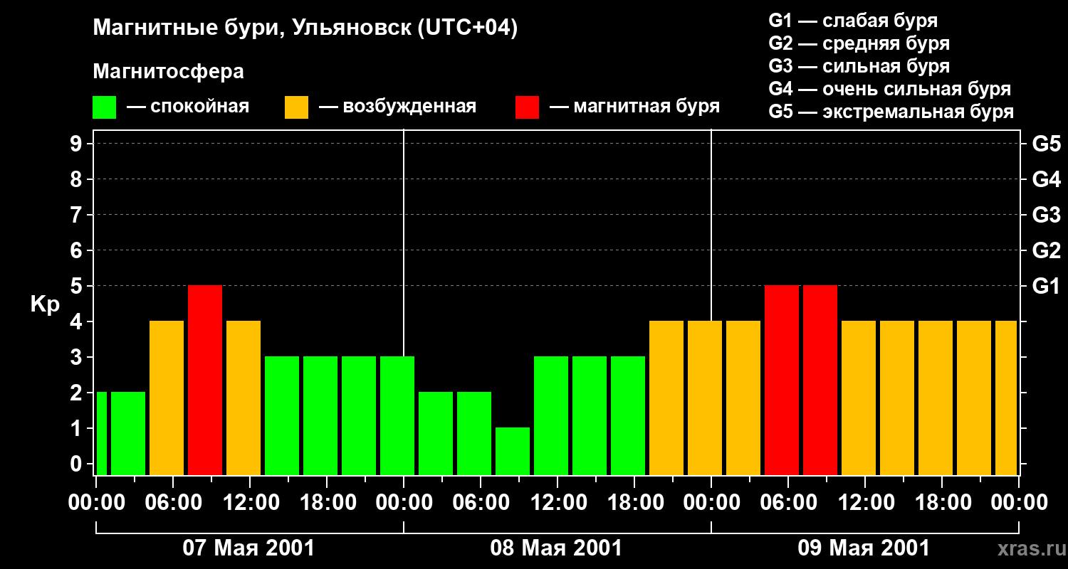 Изменения геомагнитного индекса Kp с 7 по 9 мая 2001 года для средних широт
