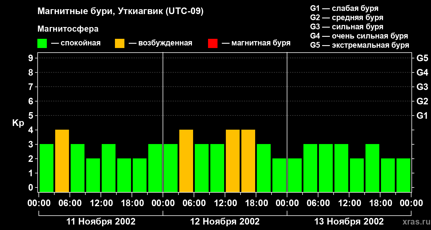Изменения геомагнитного индекса Kp с 11 по 13 ноября 2002 года для средних широт