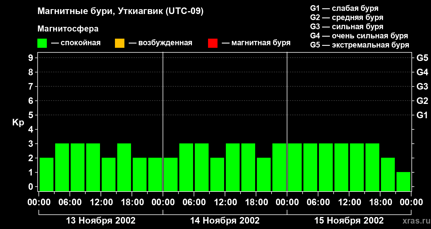 Изменения геомагнитного индекса Kp с 13 по 15 ноября 2002 года для средних широт