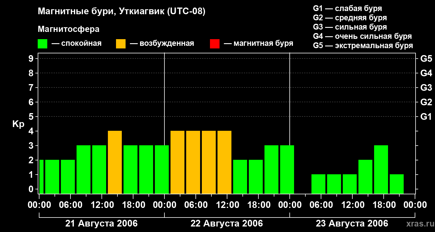 Изменения геомагнитного индекса Kp с 21 по 23 августа 2006 года для средних широт