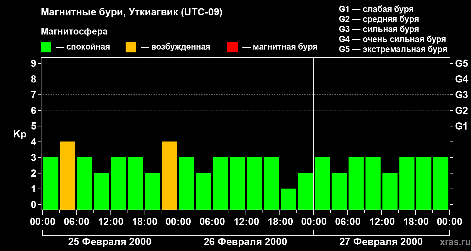 Изменения геомагнитного индекса Kp с 25 по 27 февраля 2000 года для средних широт