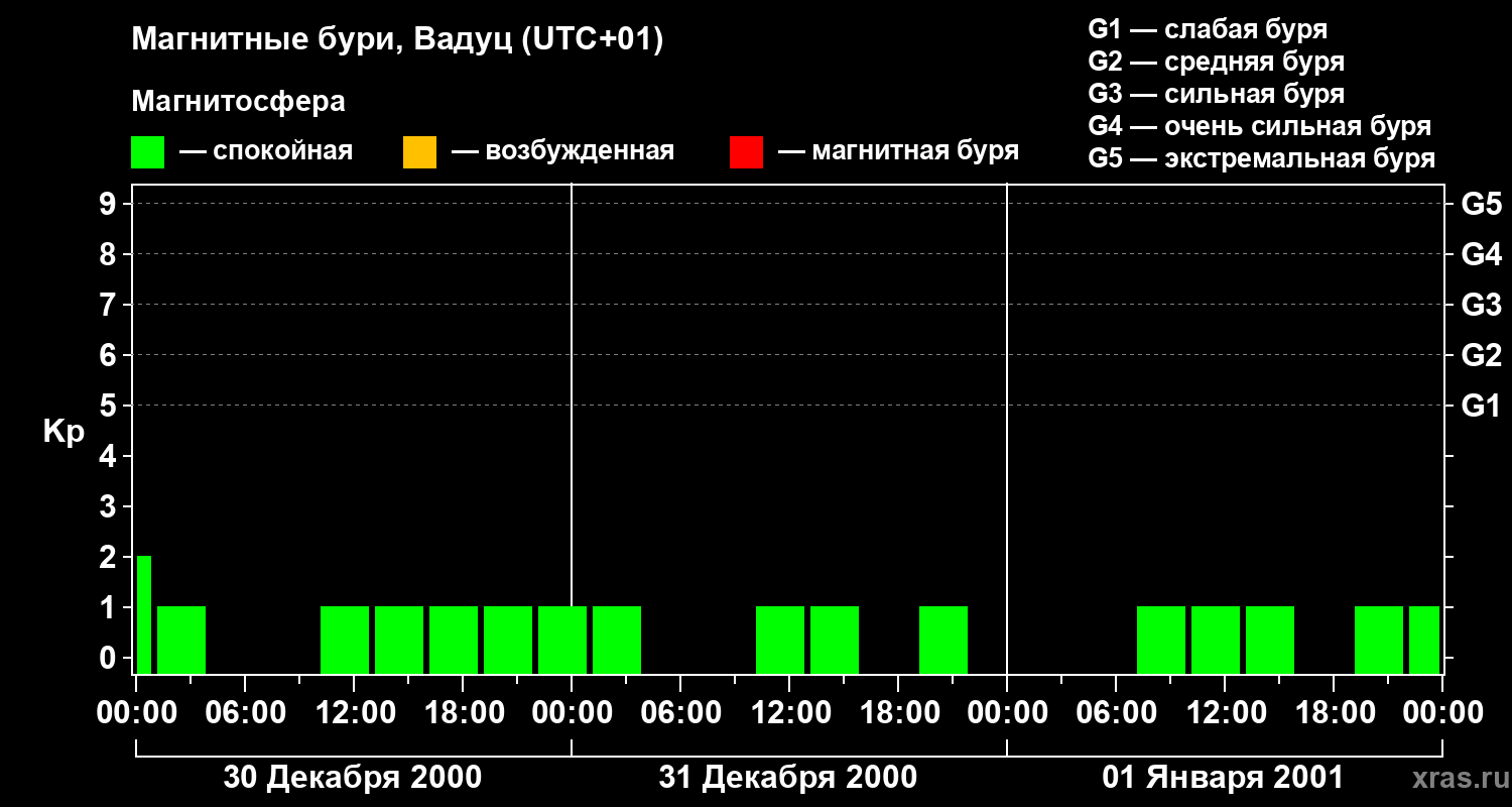 Изменения геомагнитного индекса Kp с 30 декабря 2000 года по 1 января 2001 года для средних широт
