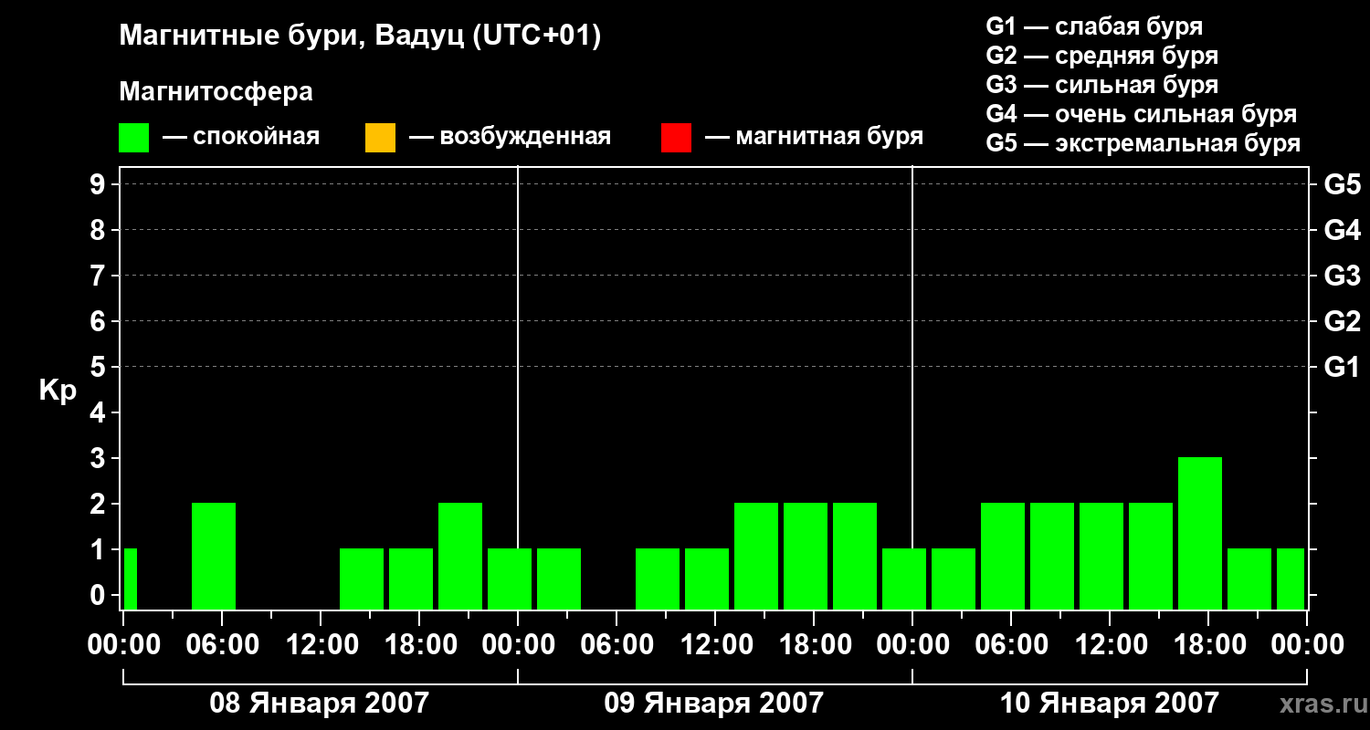 Изменения геомагнитного индекса Kp с 8 по 10 января 2007 года для средних широт