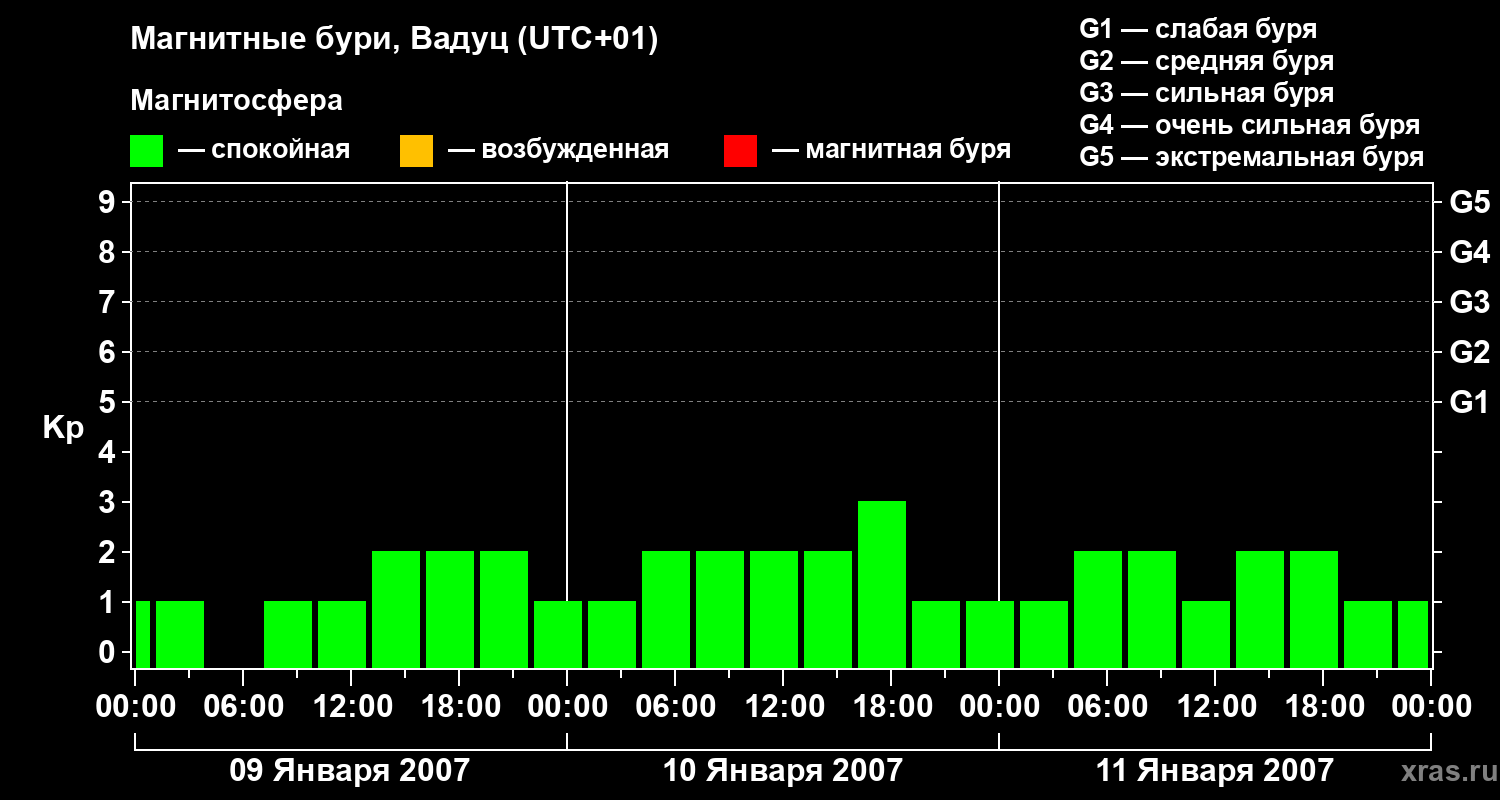 Изменения геомагнитного индекса Kp с 9 по 11 января 2007 года для средних широт