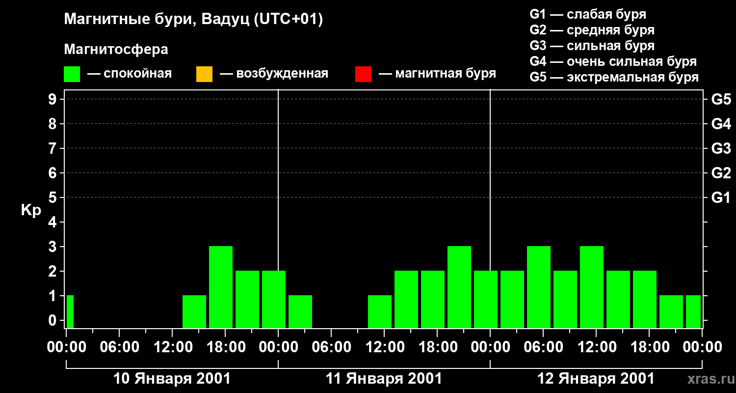 Изменения геомагнитного индекса Kp с 10 по 12 января 2001 года для средних широт