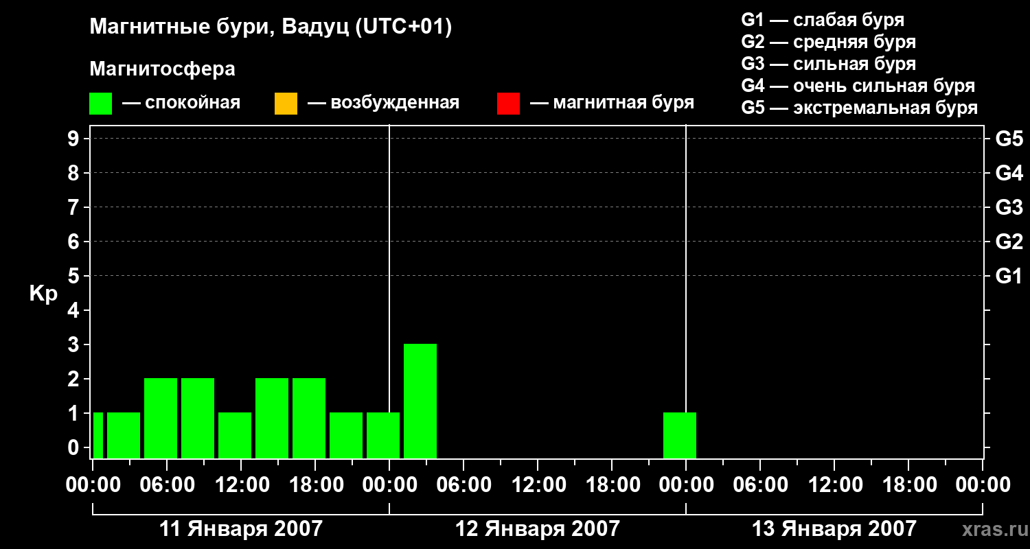 Изменения геомагнитного индекса Kp с 11 по 13 января 2007 года для средних широт