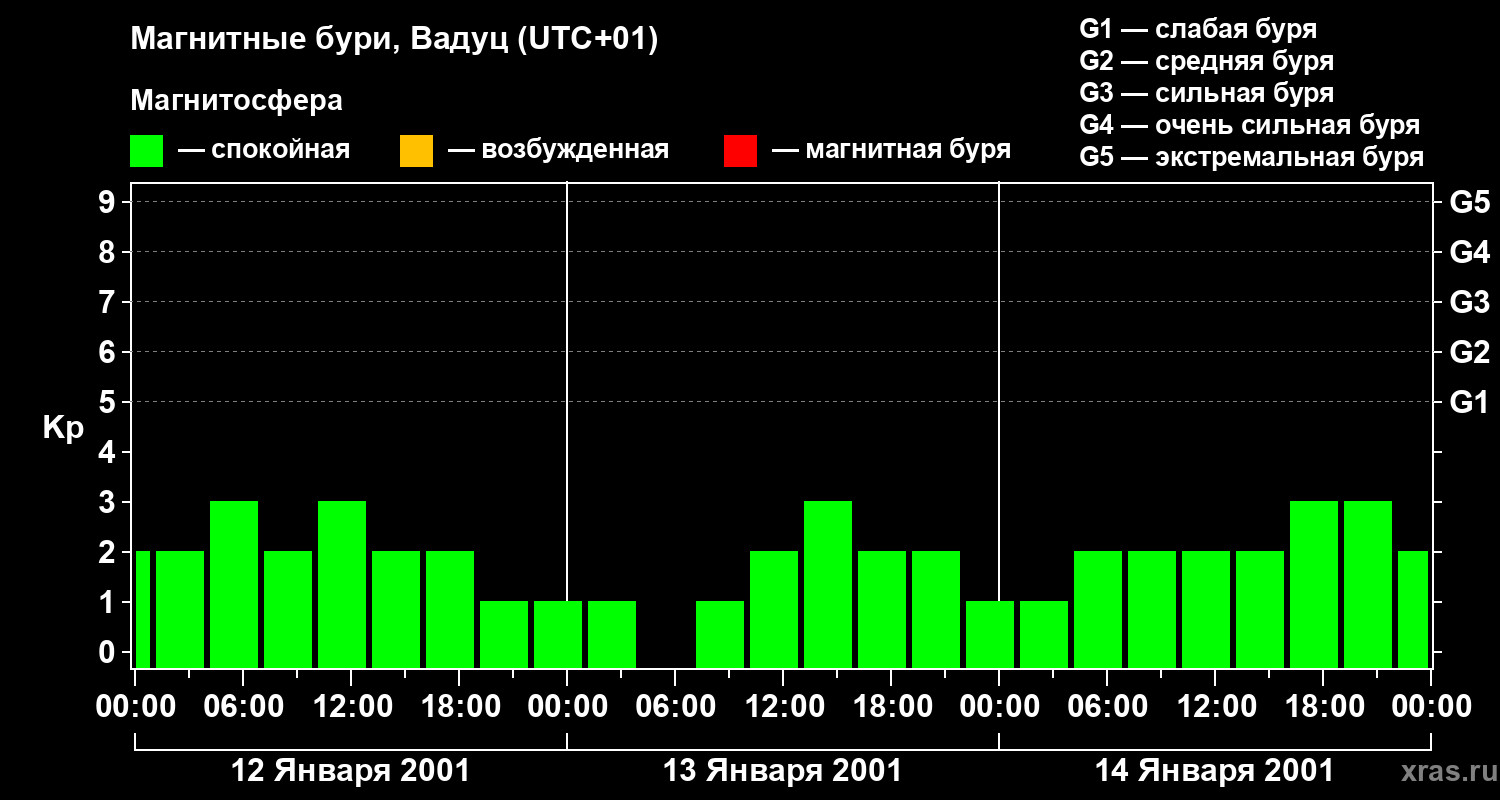 Изменения геомагнитного индекса Kp с 12 по 14 января 2001 года для средних широт
