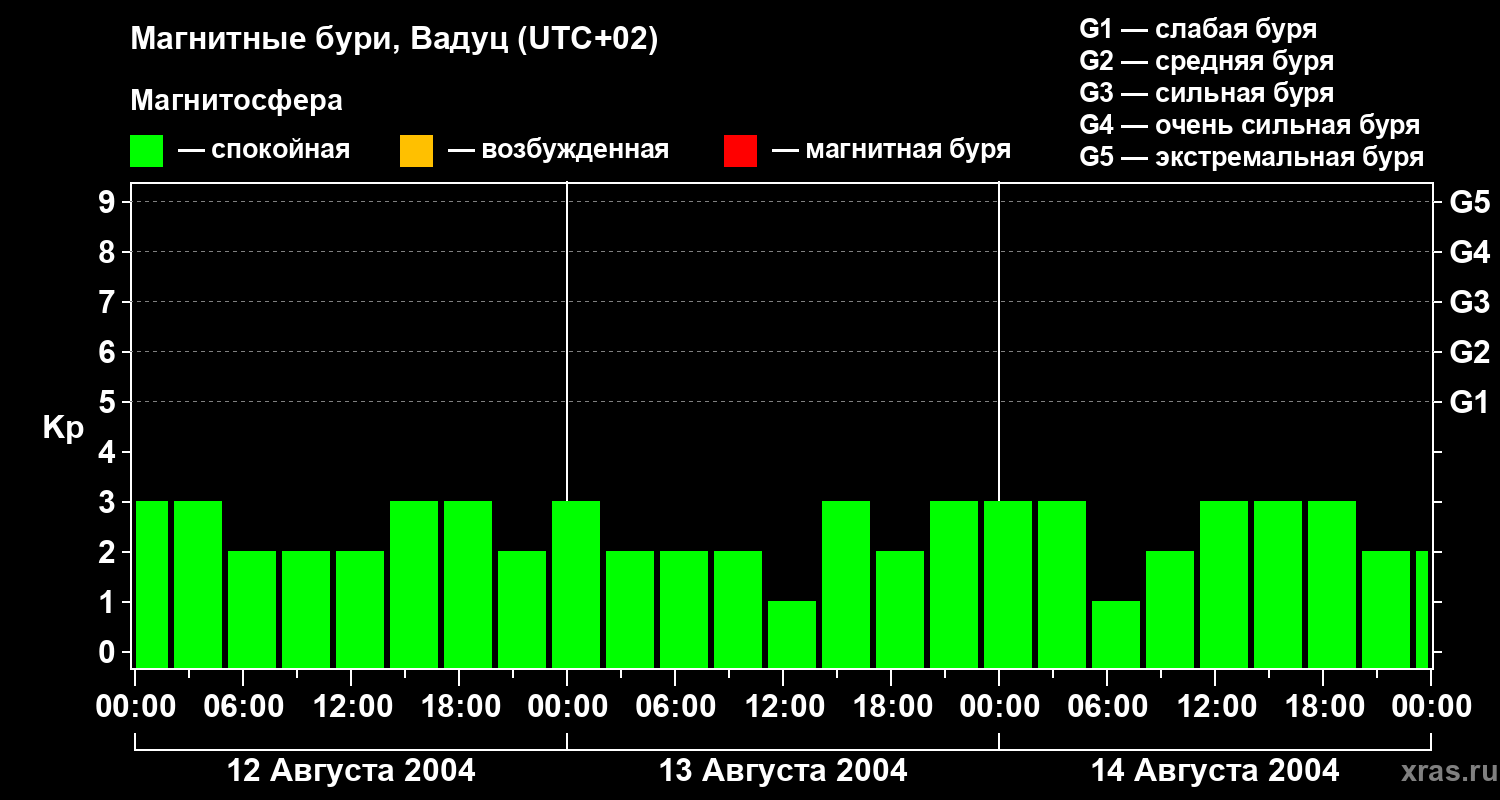 Изменения геомагнитного индекса Kp с 12 по 14 августа 2004 года для средних широт