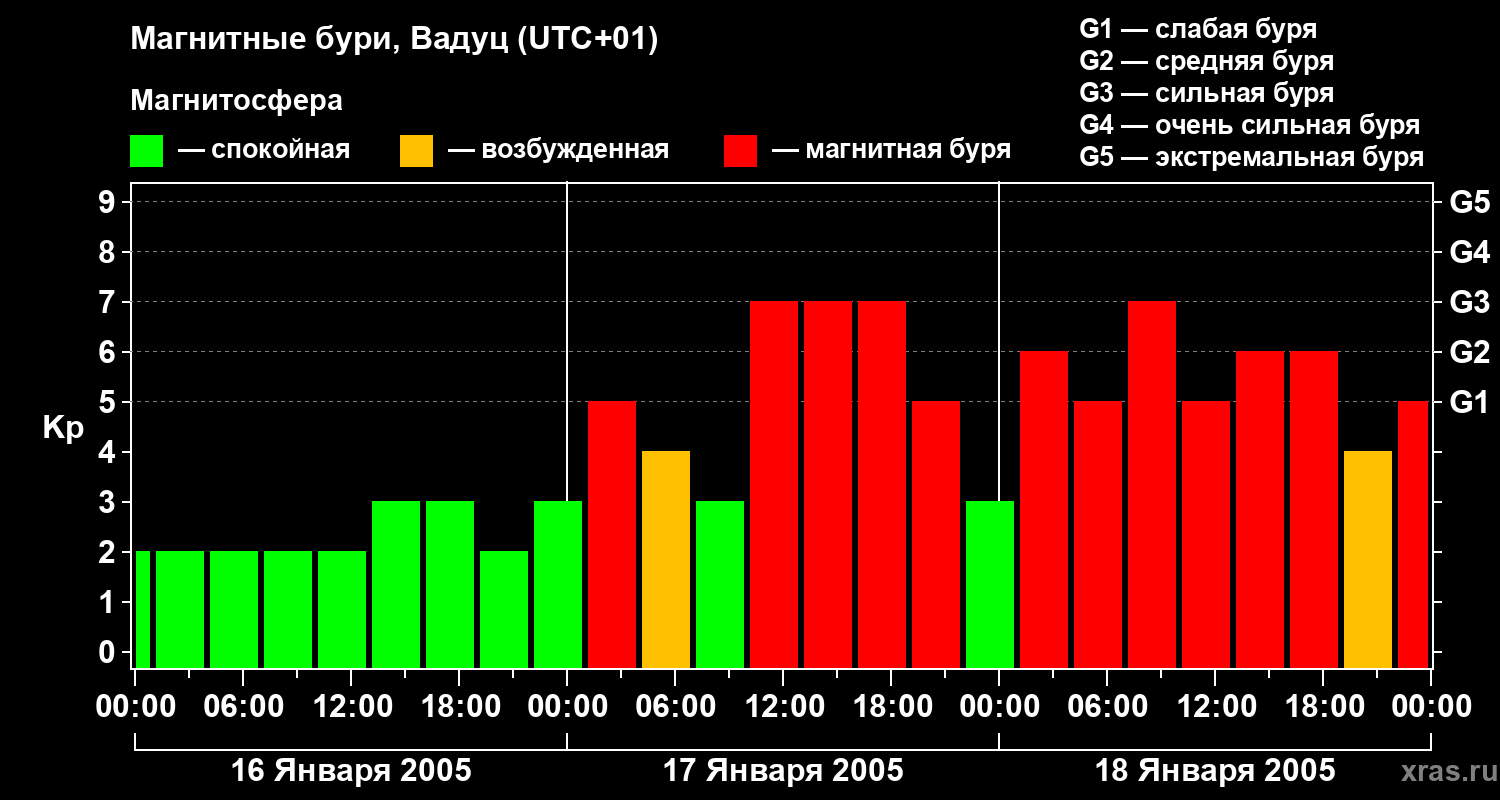 Изменения геомагнитного индекса Kp с 16 по 18 января 2005 года для средних широт