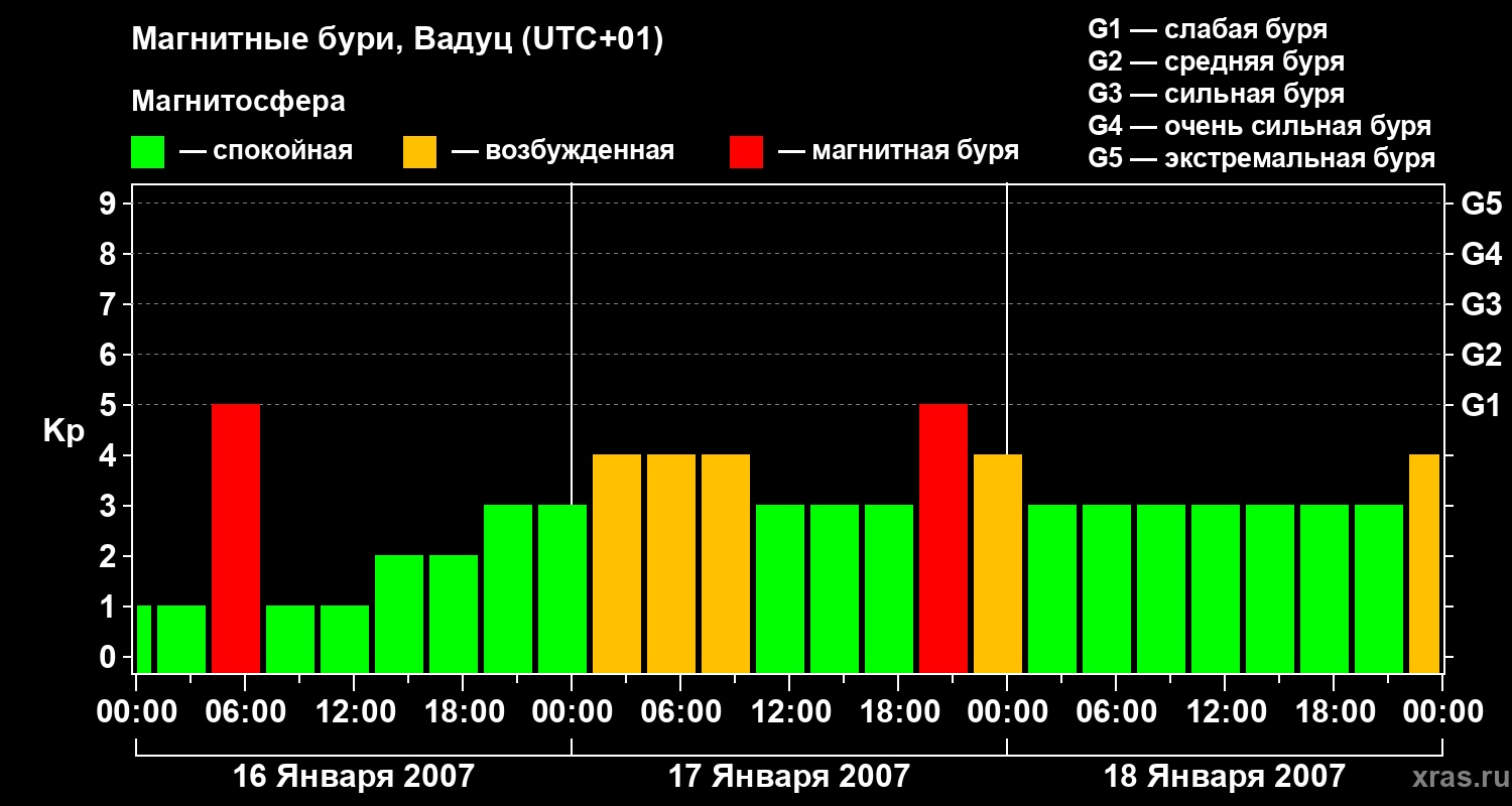Изменения геомагнитного индекса Kp с 16 по 18 января 2007 года для средних широт
