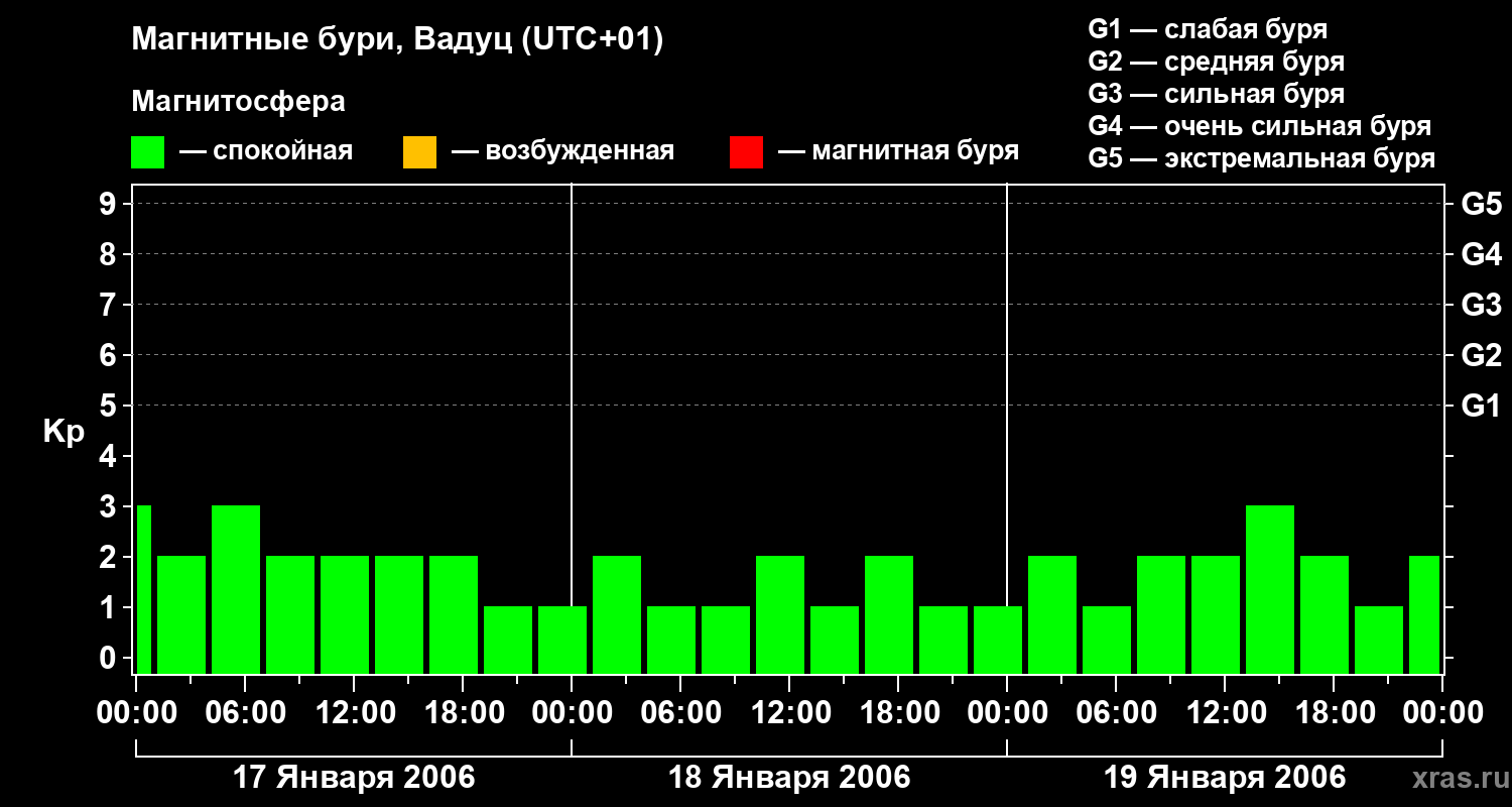 Изменения геомагнитного индекса Kp с 17 по 19 января 2006 года для средних широт