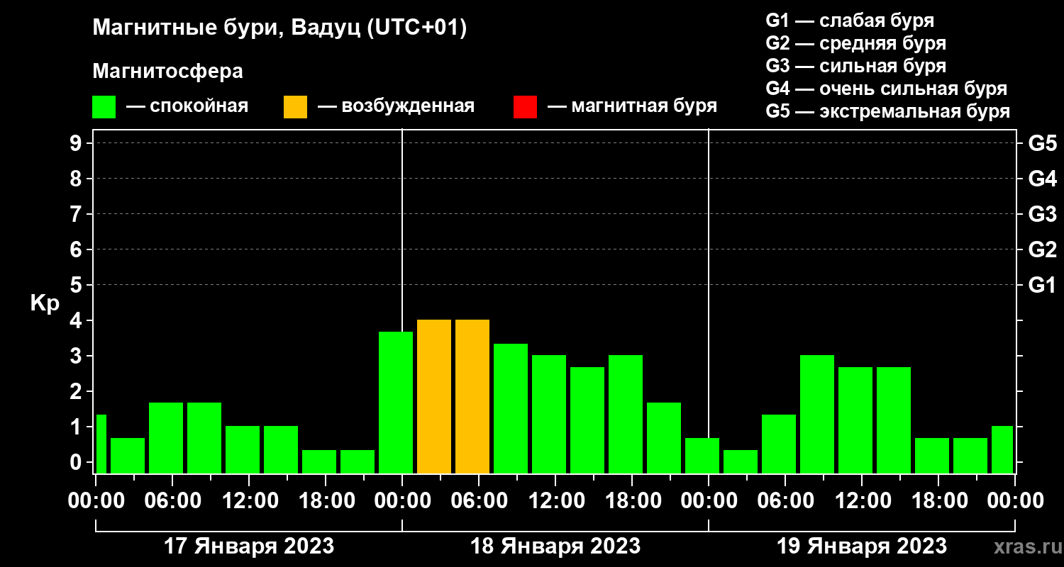 Изменения геомагнитного индекса Kp с 17 по 19 января 2023 года для средних широт