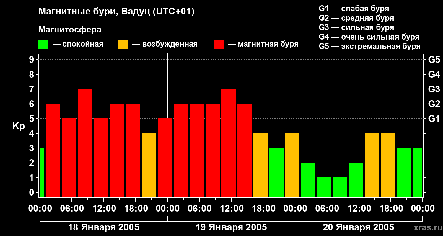 Изменения геомагнитного индекса Kp с 18 по 20 января 2005 года для средних широт