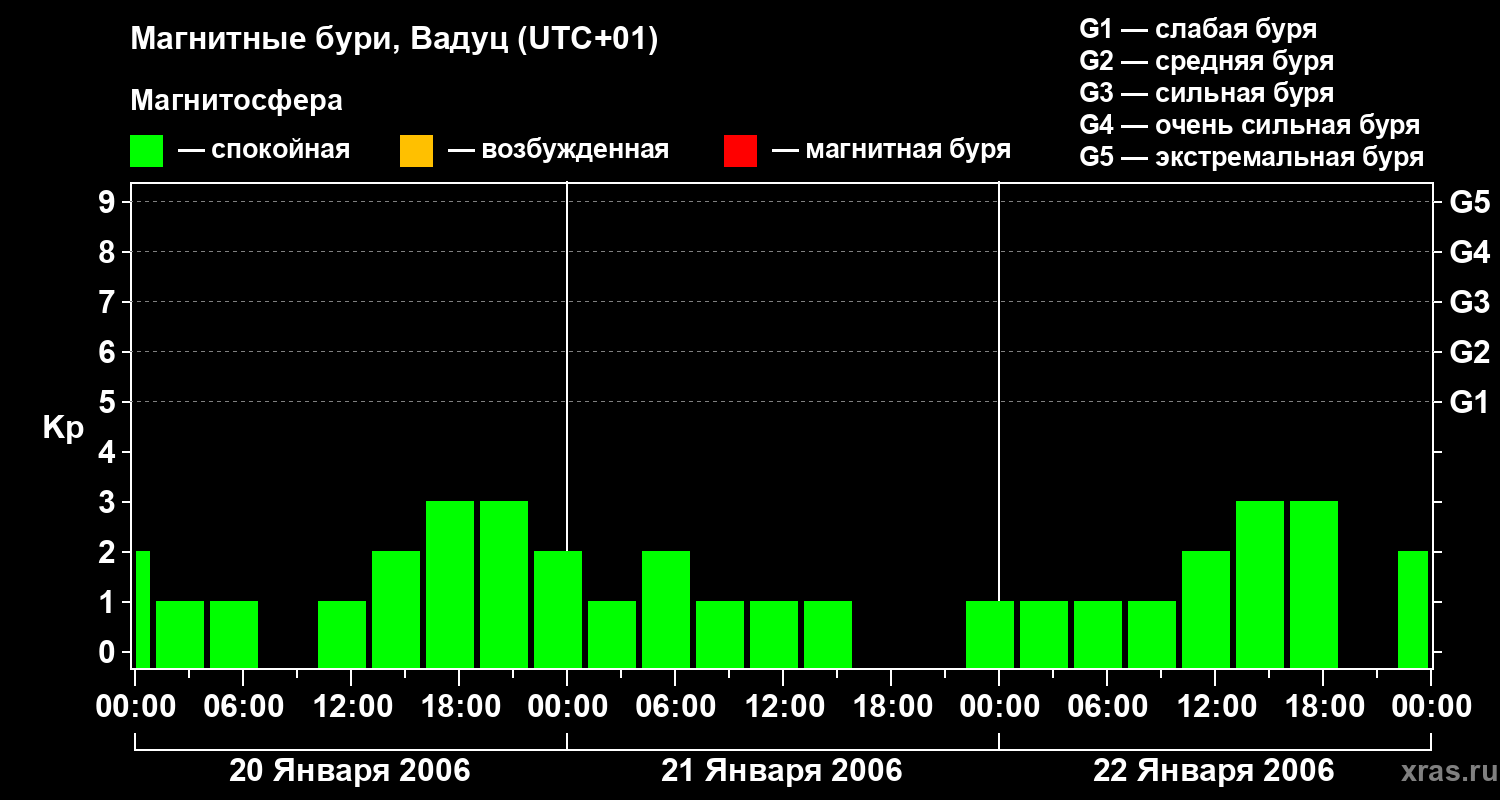 Изменения геомагнитного индекса Kp с 20 по 22 января 2006 года для средних широт