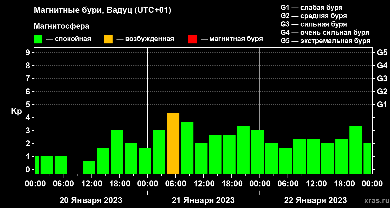 Изменения геомагнитного индекса Kp с 20 по 22 января 2023 года для средних широт